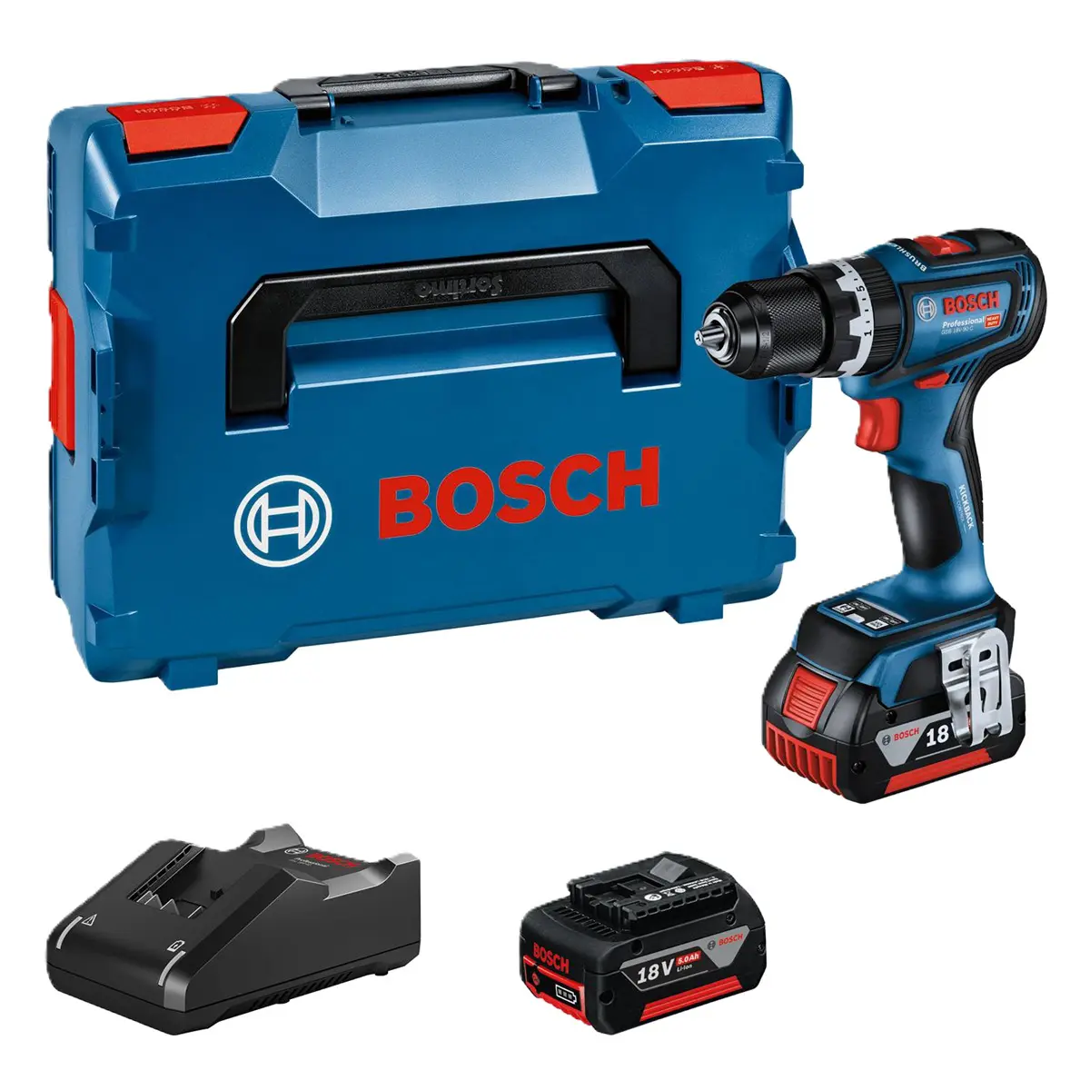Výkonný akumulátorový šroubovák BOSCH GSB 18V-90C s dvěma 5,0 Ah bateriemi a praktickým kufrem L-Boxx – profesionální nářadí pro nejnáročnější práce.