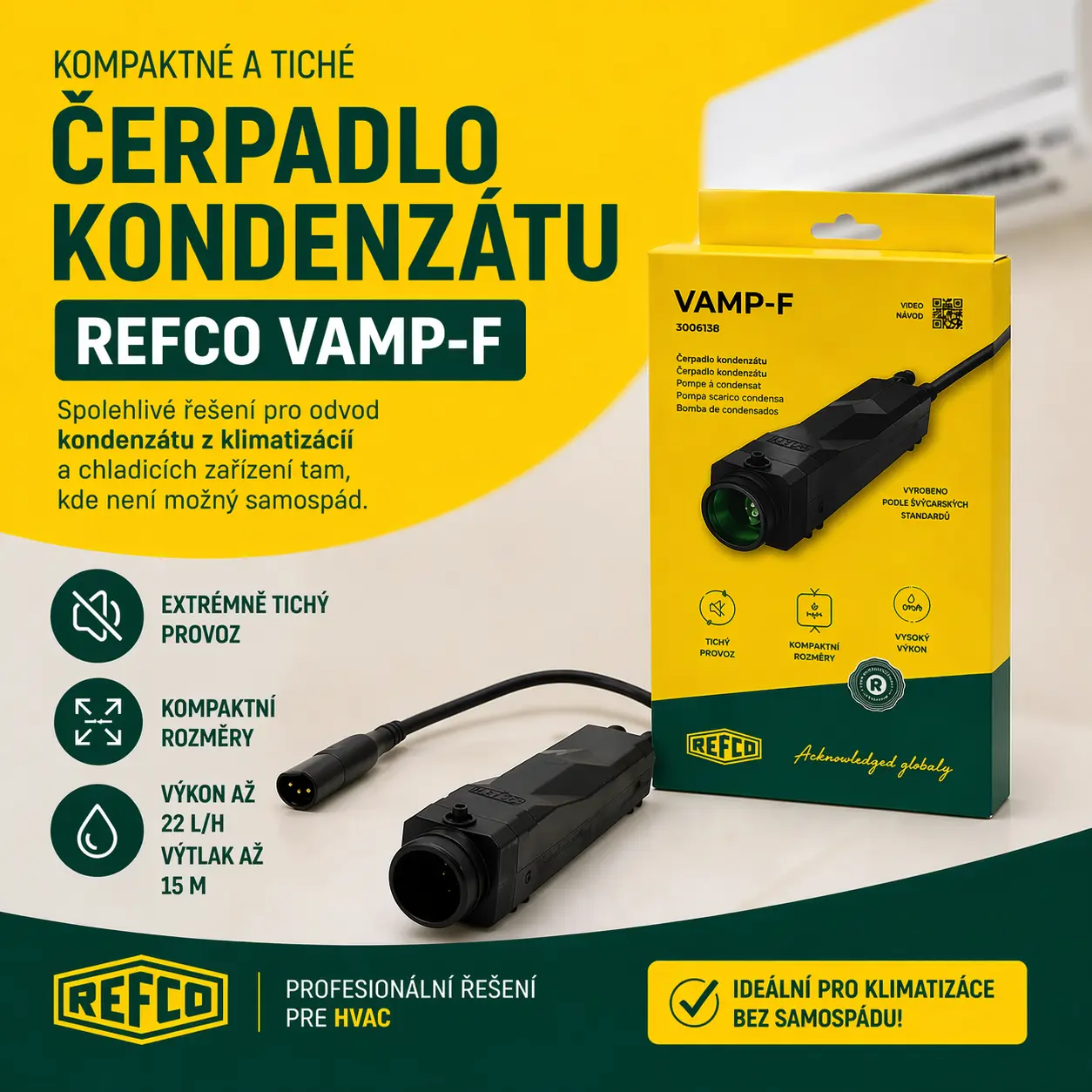 Pokud hledáte kompaktní, tiché a spolehlivé čerpadlo kondenzátu pro klimatizaci nebo chladicí zařízení, Refco VAM-F představuje praktické řešení pro profesionální montáž i bezproblémový provoz.