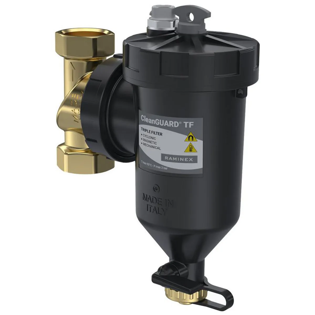 Magnetický filtr Raminex CLEANGUARD TF DN25 čistí vodu v topných a chladicích systémech, zajišťuje jejich optimální výkon a ochranu před usazeninami.