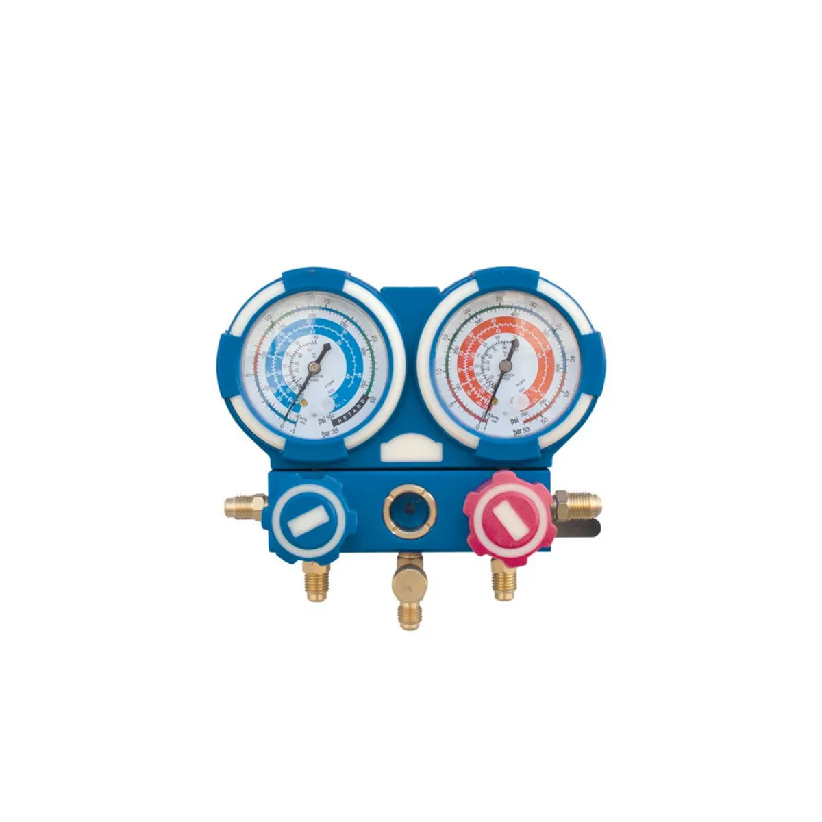 2-cestný manometr s pogumovaným povrchem pro chladiva R32, R410A, R134, TR422ABCD (R22). Přesné měření tlaku, ideální pro klimatizační systémy a opravy.