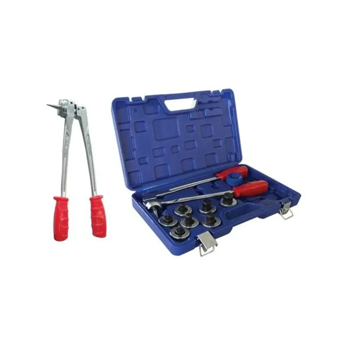 Kovový pákový rozšiřovač trubek TecnoSystemi dodávaný v kufříku, komplet s odhrotovačem a 6 vyměnitelnými hlavami pro palcové trubky velikostí 3/8″, 1/2″, 5/8″, 3/4″, 7/8″, 1 1/8″.
