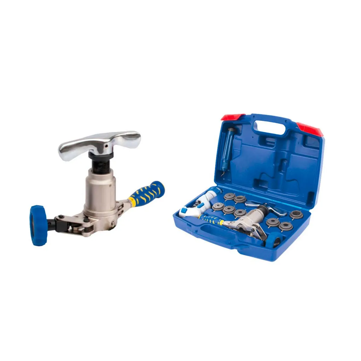 Sada obsahuje také řezačku CU trubek a odhrotovač, což zajišťuje kompletní vybavení pro práci s měděnými trubkami. Všechny nástroje jsou dodávány v praktickém přenosném kufříku pro snadné přenášení a skladování.