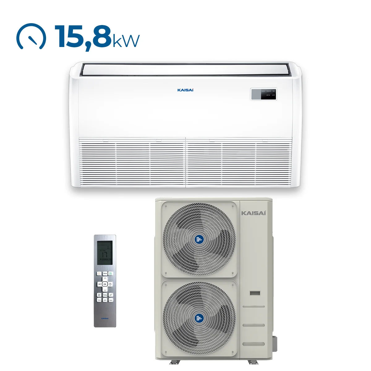 Podlahovo-stropní klimatizace KAISAI KUE nabízí flexibilní a univerzální řešení pro chlazení a vytápění různých prostor. Její design umožňuje instalaci buď u podlahy, nebo pod stropem, což z ní činí ideální volbu pro místnosti, kde je potřeba šetřit prostor nebo optimalizovat distribuci vzduchu.