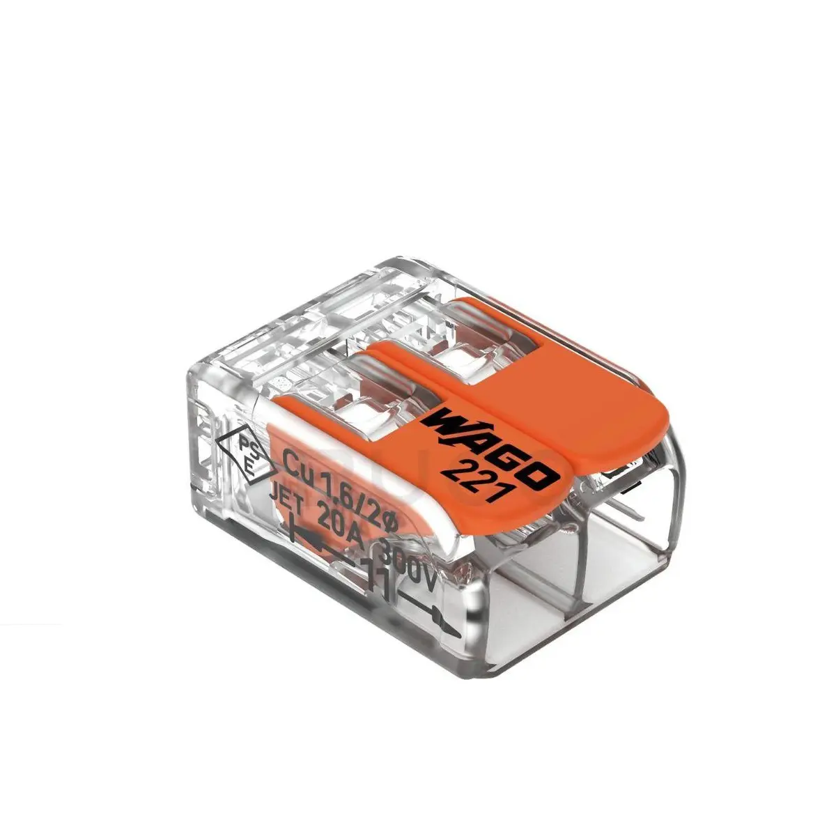 Krabicová svorka WAGO 221-412 je univerzální spojovací prvek určený pro rychlé, bezpečné a spolehlivé propojení vodičů v elektroinstalacích. Umožňuje připojení dvou vodičů s průřezem od 0,2 do 4 mm², a to jak plných, tak i laněných. Díky průhlednému krytu je možné snadno vizuálně zkontrolovat správné zasunutí vodiče.